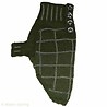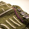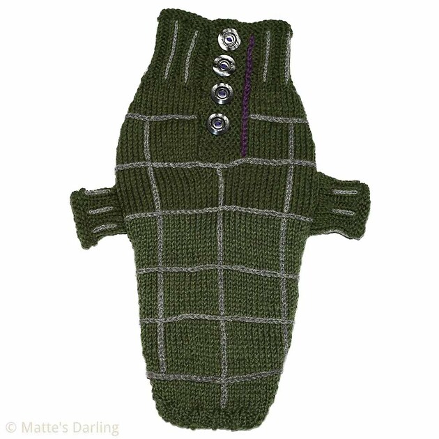 This is a Racing green sweater with checkere embroidery all over the back. It has a feel of "English contry side"...? The turtle neck and the end of the sleeves are also decorated in grey. It has a placket in WS knitting, with four grey melanged buttons, and a lilac detail.