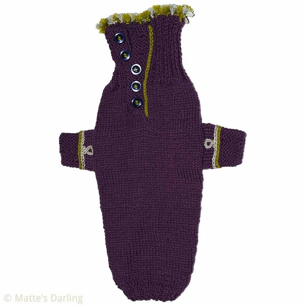 This sweater in a mellow purple, has a purl knit placket with five matching buttons. The edge of the crew neck has an unusual, handmade, fringe in spring green and light grey.There is also an embroidery, at the lower part of the sleeves, in the same colors.