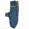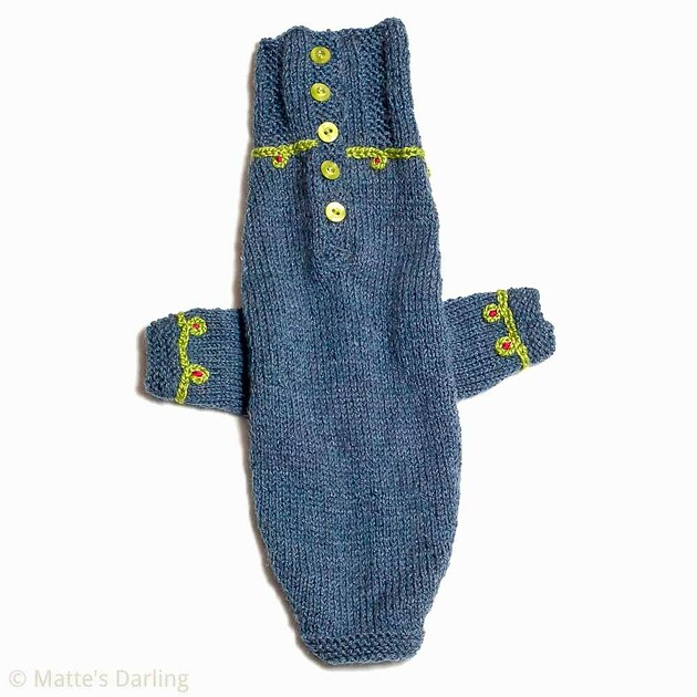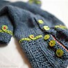 This is a dove grey sweater with a rib knit collar. It has five spring green buttons on the placket, wich is finished with a knitted trim in orange.The edge of the sleeves are purl knitted, and embroidered with a looprank in green and tiny cerise dots, also repeated around the neckline.