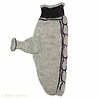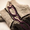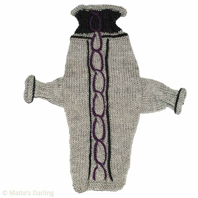 This light grey sweater has a lot of intricate details. The collar, in charcoal, has a wound up edge, as well as the sleeves. The braid that runs along the back, is embroidered in purple and charcoal, and continuous into the collar in a clever way.