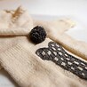 This cool sweater is knitted as a hoodie, with a grey, handmade pompom at the top.