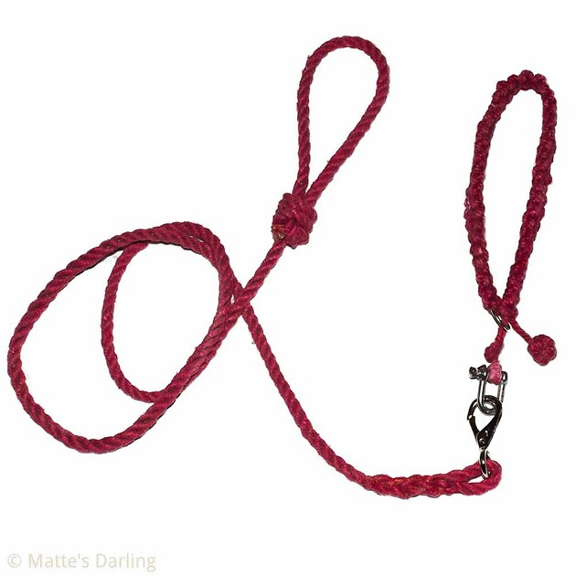 This collar is made of 100% plant fibre, hand dyed in a muted rasberry red color, with a monkey fist detail.