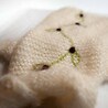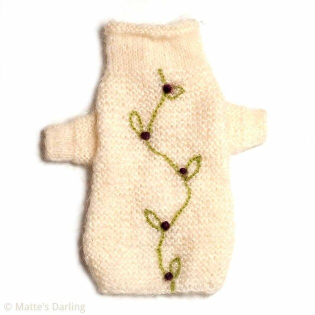It's garter knitted with a woundup single turtelneck,and a two button placket for a perfect fit and easy dressing. On the back of the sweater is a delicate embroidered loop with leafs and little purple pompoms.